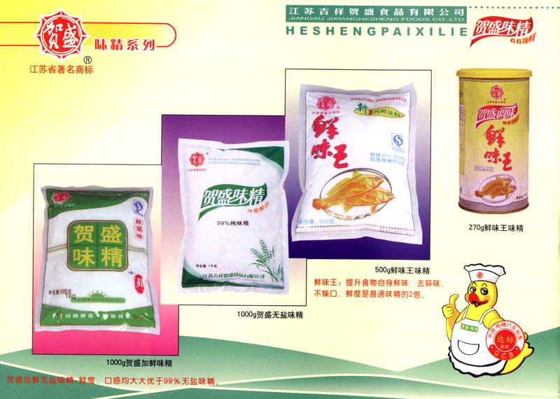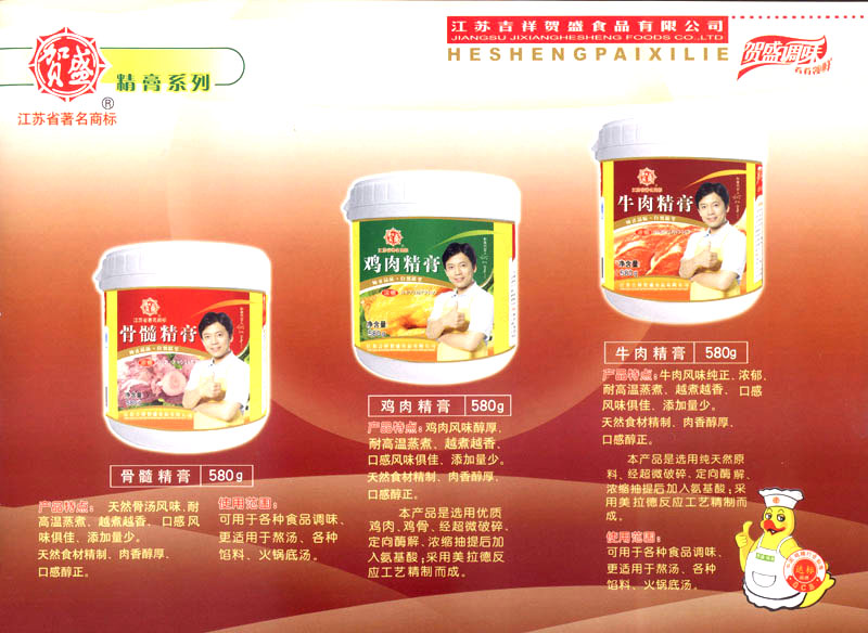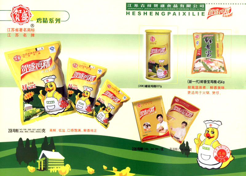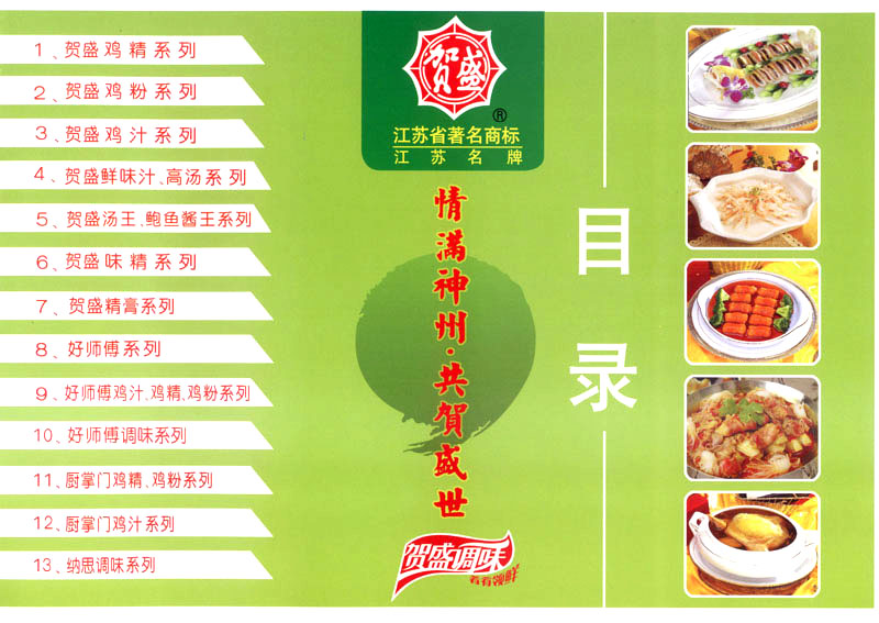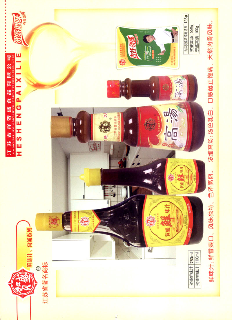 江蘇吉祥賀盛食品有限公司是一家中國專業(yè)餐料知名制造商,公司座落在經(jīng)濟(jì)高度發(fā)達(dá)“長三角”的常州市,緊靠312國道,滬寧高速與沿江高速交匯處,距常州火車站及長江水運(yùn)碼頭20千米,交通十分便利。公司占地面積23500平方米,花園式工廠、廠房面積18500平方米,現(xiàn)在員工330余名,其中擁有中、高級職稱管理和技術(shù)人員58名,生產(chǎn)場地均按食品和藥品GMP要求設(shè)計(jì)、全封閉車間、中央空調(diào)系統(tǒng)、閉路電視監(jiān)控系統(tǒng)。目前已建成成三條雞精,雞粉生產(chǎn)線。一條雞汁生產(chǎn)線。一條鮮味汁生產(chǎn)線。一條醬汁精膏類生產(chǎn)線,規(guī)劃年生產(chǎn)能力達(dá)30000噸。 “賀盛”品牌取自《詩·大雅·下武》中“受天之祜、 四方來賀”;《易經(jīng)》中“富有謂之大業(yè),日新之謂盛德”,賀盛企業(yè)師法源遠(yuǎn)流長中華飲食文化,融匯中西健康美食調(diào)味。相繼研發(fā)生產(chǎn)出高品質(zhì)的“賀盛牌”味精、雞精、雞粉、雞汁、湯王、鮑魚醬王、鮮味汁調(diào)味素和各種風(fēng)味熱反應(yīng)精膏等系列產(chǎn)品。二十年來“賀盛”產(chǎn)品質(zhì)量獲得廚藝界專業(yè)人士和消費(fèi)者的一致好評和高度認(rèn)可。 賀盛企業(yè)和產(chǎn)品相繼榮獲1995年“首界中國國際食品博覽會金獎”,2001年企業(yè)通過ISO-9001國際質(zhì)量體系認(rèn)證,2003年江蘇省“計(jì)量保證確認(rèn)單位”,2004年獲得自營出口權(quán),2005年賀盛雞精榮獲“江蘇名牌產(chǎn)品”,2006年賀盛商標(biāo)被評為“江蘇省著名商標(biāo)”,2007年通過HACCP認(rèn)證,全部產(chǎn)品均通過QS食品安全認(rèn)證,并積極努力爭創(chuàng)中國名牌,中國馳名商標(biāo)。 公司銷售網(wǎng)點(diǎn)建設(shè)發(fā)展迅速,相繼組建上海、南京、河南、海南、新疆全資分公司;辦事處、經(jīng)銷商覆蓋全國,并出口日本、香港及東南亞地區(qū)。二十年來,在公司總裁周國林先生帶領(lǐng)下,全體同仁秉承“厚德載物、自強(qiáng)不息”宗旨,發(fā)揚(yáng)“以人為本、科技創(chuàng)新、自我加壓、爭創(chuàng)一流”的企求精神;致力于傳承中華飲食文化,融化西方美食精粹,不斷的研發(fā)、創(chuàng)新,奉獻(xiàn)更多更好的調(diào)味料,讓生活更有滋味。公司總裁周國林先生攜全體員工熱誠歡迎各位新老朋友蒞臨指導(dǎo),洽談合作!