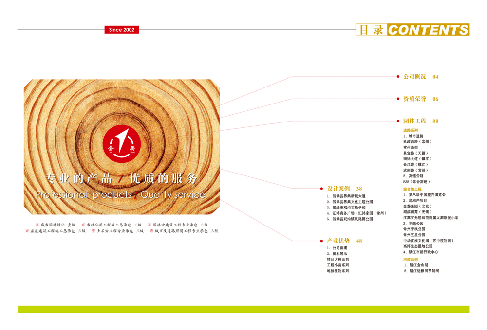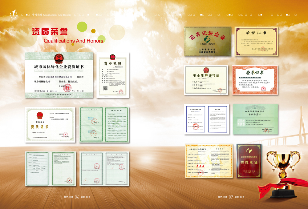 公司以園林綠化工程、市政公用工程、古建筑施工及景觀設(shè)計(jì)為主要業(yè)務(wù)的綜合性公司。并具備園林綠化一級(jí)、市政公用二級(jí)、鋼結(jié)構(gòu)三級(jí)、古建筑三級(jí)、房屋建筑工程施工總承包三級(jí)和城市及道路照明工程專業(yè)承包三級(jí)資質(zhì)企業(yè)。公司組織機(jī)構(gòu)健全、管理制度完善,具備獨(dú)特的經(jīng)營理念和服務(wù)精神。公司技術(shù)力量雄厚,機(jī)械設(shè)備齊全。公司已取得AAA級(jí)資信等級(jí)、重合同守信用企業(yè),通過ISO9001國際認(rèn)證體系并取得證書。目前我公司自主培育苗圃1000余畝,常年生產(chǎn)各種常綠、落葉喬木,花灌木、各類盆景、草坪、地被等植物百余種,年產(chǎn)各類苗木250萬株,盆花130萬盆,暢銷省內(nèi)外各地。