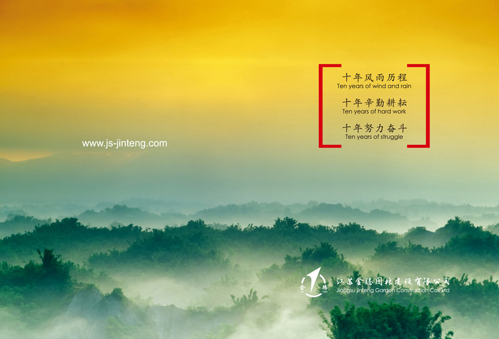 走過十年的風(fēng)雨歷程,經(jīng)過十年的辛勤耕耘,付出十年的努力奮斗,企業(yè)的規(guī)模不斷擴(kuò)大,公司堅(jiān)持以人為本,遵守“誠信、規(guī)范、團(tuán)結(jié)、奮斗”的宗旨。公司將用優(yōu)秀的品質(zhì)服務(wù)來回報(bào)關(guān)愛公司成長的社會(huì)各界人士。江蘇金騰園林建設(shè)有限公司愿攜手社會(huì)各界有識(shí)之士共創(chuàng)造美好的未來!
