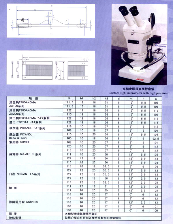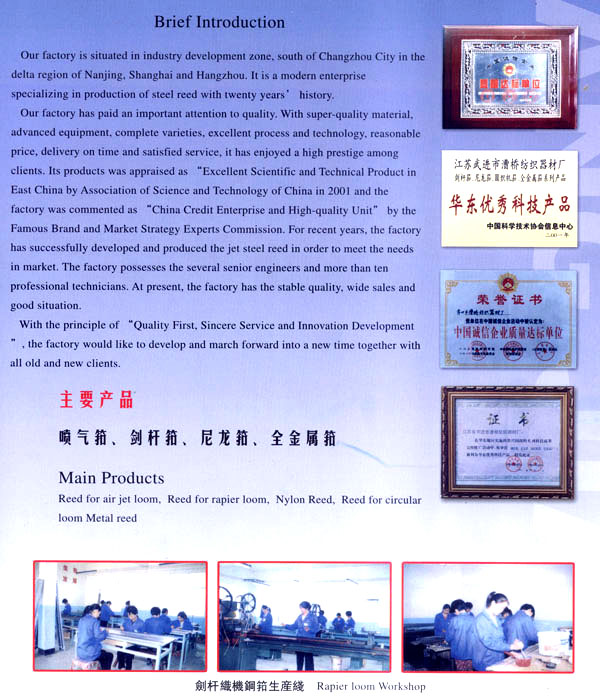 漕橋紡織器材廠位于常州市南郊寧、滬、杭金三角漕橋工業(yè)開發(fā)區(qū),是全國專業(yè)生產(chǎn)鋼筘規(guī)模較大的現(xiàn)代化廠家,已具有20年的歷史。 本廠生產(chǎn)的鋼筘有噴氣、劍桿筘、尼龍筘、圓織機筘和金屬筘分鉸筘、織帶筘、無梭織帶筘……本廠特別擅長生產(chǎn)高密度的劍桿筘。 本廠素以質(zhì)量為重,均采用優(yōu)質(zhì)材料制筘,如噴氣筘使用的筘片膠水鋁架等,均采用日本進口的材料;劍桿筘筘片采用日本進口的57B線材,膠水均采用紡織部定點的陜西紡織研究所生產(chǎn)的優(yōu)質(zhì)膠水、高密度劍桿筘均用進口膠水制筘;全金屬筘均用云南的優(yōu)質(zhì)錫制筘。 各種鋼筘筘面的平整度,筘齒的均勻度、垂直度,筘片的彈性度,膠水的牢固度廣大用戶使用后感到滿意放心,特別是使用壽命特別長,受到用戶一致的盛贊,真是料好筘好,筘好布好。 本廠為了使質(zhì)量精益求精,增添了不少先進設(shè)備,并聘請了數(shù)名高級工程師和十多位具有專業(yè)知識的技術(shù)人員把關(guān)。由于質(zhì)量穩(wěn)定可靠,2001年被中國科學(xué)技術(shù)協(xié)會評為“華東優(yōu)秀科技產(chǎn)品”二00二年被中國管理科學(xué)研究院名牌與市場戰(zhàn)略專家委員會評為“中國誠信企業(yè)質(zhì)量達標(biāo)單位”。 今本廠產(chǎn)品暢銷全國20多個省市,價格優(yōu)惠,供不應(yīng)求,形勢喜人。 本廠本著“以質(zhì)取勝、誠信服務(wù)、創(chuàng)新發(fā)展”的宗旨,愿與廣大新老客戶攜手共肩,昂首走進新時代,迎接新的挑戰(zhàn)。