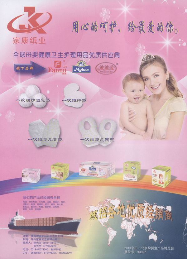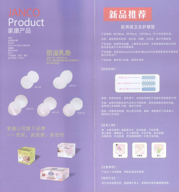 中國(JANCO)家康衛(wèi)生用品公司成立于2004年,我們專注于研發(fā)、設(shè)計(jì)、及制造健康的衛(wèi)生用品。我們的產(chǎn)品包括防溢乳墊、汗墊、寶寶背墊、圍兜、護(hù)理墊等。我們的生產(chǎn)廠房建設(shè)在中國江蘇省常州市,這是一個(gè)非常美麗的城市,并且我們的廠區(qū)鄰近沿江高速,交通非常便利。 我們擁有國際一流的生產(chǎn)設(shè)備、先進(jìn)的檢測儀器、無菌的生產(chǎn)車間。我們每一個(gè)產(chǎn)品都經(jīng)過家康人專心、專業(yè)的制造,我們注重每一個(gè)細(xì)節(jié),不斷的研發(fā)更舒適、更健康、更人性化的產(chǎn)品,旨在為您提供更滿意的服務(wù)。我們也可以根據(jù)您的需求研發(fā)、設(shè)計(jì)、生產(chǎn)不同的產(chǎn)品。我們的產(chǎn)品已遠(yuǎn)銷海外,并且得到非常好的評(píng)價(jià)。出口的國家有美國、加拿大、英國、意大利、俄羅斯、南非、泰國等。人性化的設(shè)計(jì)、優(yōu)秀的品質(zhì)、完善的售前、售后服務(wù)及合理的價(jià)格使我們的客戶與我們的合作感到非常的愉快。 我們已經(jīng)通過了ISO9000和FDA認(rèn)證,我們將感到非常榮幸能夠與您合作。 我們非常樂意與中國的經(jīng)銷商共同分享我們的產(chǎn)品,我們將非常期待您的信任和加盟。 我們將一如既往的為您提供:更舒適的、更健康的產(chǎn)品。