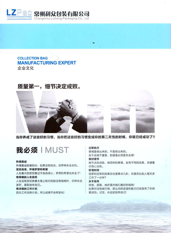 常州利眾包裝有限公司成立于2009年。經(jīng)過10多年的發(fā)展,已發(fā)展成為規(guī)模型的集成袋生產(chǎn)與研發(fā)基地。公司擁有四條拉絲生產(chǎn)線,20余臺(tái)各式圓織機(jī)、10余臺(tái)織帶機(jī),1臺(tái)寬幅涂膜機(jī),10余臺(tái)自動(dòng)裁剪機(jī),200多臺(tái)各式縫紉設(shè)備,其中電腦縫紉設(shè)備多達(dá)40多臺(tái)。公司月產(chǎn)各種中高檔集裝袋20萬條左右。 擁有強(qiáng)大的質(zhì)量管理系統(tǒng)。公司成立初期就通過了ISO9001的體系論證。公司奉行“質(zhì)量第一,客戶至上”的經(jīng)營(yíng)理念,始終堅(jiān)持以質(zhì)量謀發(fā)展的原則,執(zhí)著追求以新工藝,新設(shè)備,高效率不斷優(yōu)化生產(chǎn)流程,降低生產(chǎn)成本以適應(yīng)市場(chǎng)。常州利眾包裝有限公司地處美麗的江南水鄉(xiāng)——常州。地理位置十分優(yōu)越。 公司主打產(chǎn)品為各種中高端集裝袋。包括各式拉筋袋,導(dǎo)電袋,抗靜電袋。公司客戶清單中包括有很多的國(guó)際知名企業(yè),世界500強(qiáng)企業(yè)。 眾包裝——你的包裝解決方案。