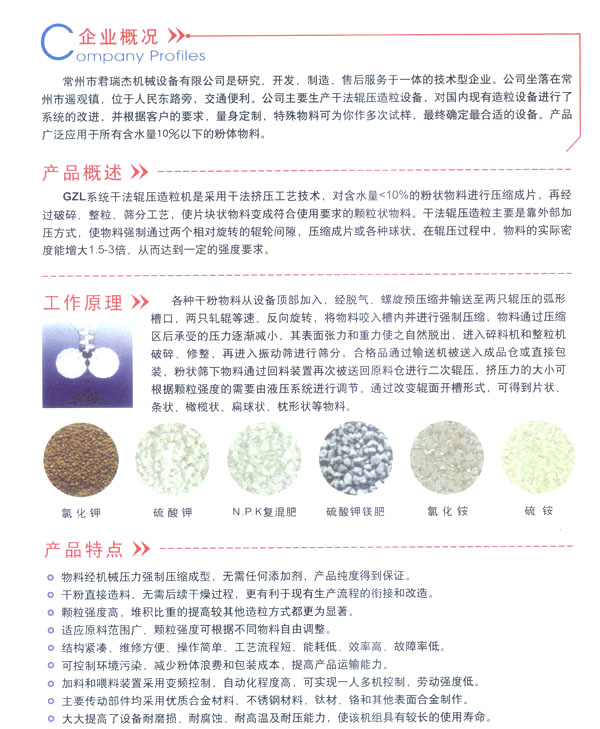 常州市君瑞機(jī)械設(shè)備有限公司是研究、開發(fā)、制造及售后服務(wù)于一體的技術(shù)型企業(yè)。公司坐落于常州市橫山橋金豐工業(yè)集中區(qū),毗鄰戚月公路與232省道,距滬蓉高速3公里,地理位置優(yōu)越,交通便捷。 公司在干燥造粒設(shè)備的開發(fā)、研究中不斷地創(chuàng)新及改造,設(shè)計(jì)制造了一系列工藝先進(jìn)且節(jié)能的產(chǎn)品。并根據(jù)市場(chǎng)的需要研制開發(fā)了幾十種干燥、造粒、混合、除塵系列,產(chǎn)品廣泛適用于肥料,石膏粉.制藥、化工、食品、輕工,煤粉,各類助劑.工業(yè)原料等行業(yè)深受用戶好評(píng)。主要生產(chǎn)干法輥壓造粒設(shè)備,對(duì)國(guó)內(nèi)現(xiàn)有的造粒設(shè)備進(jìn)行了系統(tǒng)的改進(jìn),并根據(jù)客戶的要求,量身定制,特殊物料可為你作多次試樣,最終確定最適合的設(shè)備。產(chǎn)品廣泛用于所有含水量10%一下的粉體物料。 公司秉承“以技術(shù)和人才為本,以市場(chǎng)需求為導(dǎo)向”,我們不僅向客戶提供優(yōu)質(zhì)的產(chǎn)品,而且以全方位的服務(wù)滿足眾多客戶的更新、更高的要求。 熱忱歡迎新老客戶、國(guó)內(nèi)外各界朋友蒞臨指導(dǎo),攜手共進(jìn),共創(chuàng)未來!
