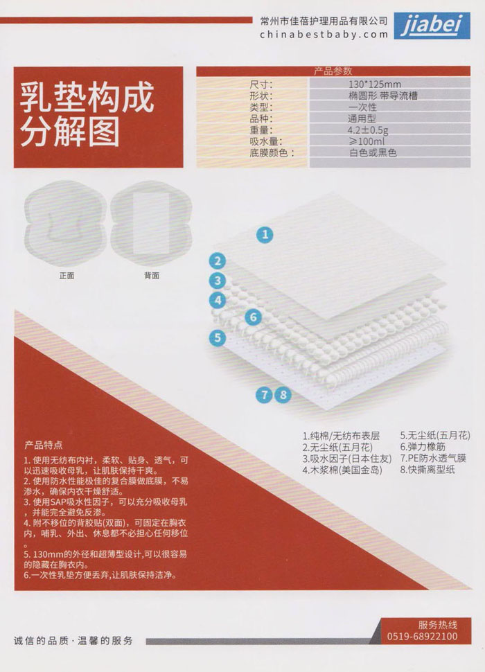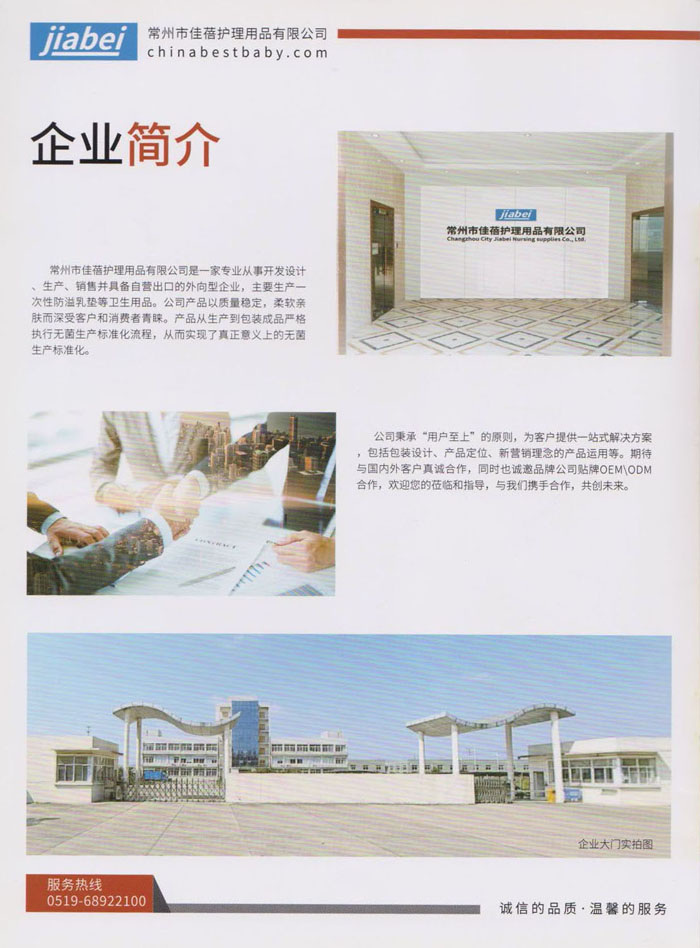 常州市佳蓓護(hù)理用品有限公司是一家專業(yè)從事開發(fā)、生產(chǎn)、銷售并具備自營出口的外向型企業(yè),主要生產(chǎn)“一次性防溢乳墊“,以質(zhì)量穩(wěn)定,柔軟親膚而深受客戶和消費(fèi)者青睞。本公司產(chǎn)品從生產(chǎn)到包裝成品嚴(yán)格執(zhí)行無菌生產(chǎn)標(biāo)準(zhǔn)化流程,并和設(shè)備生產(chǎn)廠家合作開發(fā)了兩條從進(jìn)料、生產(chǎn)、檢測(cè)、滅菌、成品包裝的無菌生產(chǎn)線,從而實(shí)現(xiàn)了真正意義上的無菌生產(chǎn)標(biāo)準(zhǔn)化。
