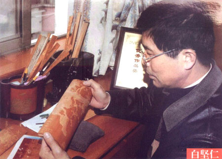白堅仁,1956年生于江蘇常州,國家級非物質(zhì)文化遺產(chǎn)、江蘇省級傳承人、江蘇省名人,高級工藝美術(shù)師,是留青竹刻泰斗白士風(fēng)之子。從小深受先父的熏陶和指點,寒來署往、夜以繼日,不僅學(xué)到了先父厚樸豁達的品格,更深得先父竹刻藝術(shù)的真諦。除繼承刻有先父創(chuàng)立的橫臺屏、筆筒等作品外,更注重作品的創(chuàng)新。多年來,經(jīng)過艱辛的探索和反復(fù)的實踐,努力吸取姐妹藝術(shù),成功地采用了多片拼裝,配上紅木框架,制成大型的圖文并貌的作品,如帽籠、大插屏、鏡框掛件、四條屏、甚至中堂。在構(gòu)圖內(nèi)容、技法變化、裝幀形式等方面,都走出了創(chuàng)新之路,使所制作品適應(yīng)了現(xiàn)代人們的審美情趣和生活需求,實現(xiàn)了多年來要使留青竹刻與書畫作品同樣也能懸掛于廳堂之上的愿望。作品多次在國內(nèi)、國際展覽中獲獎,并獲得了留青竹刻史上的首位二項國家專利擁有者。