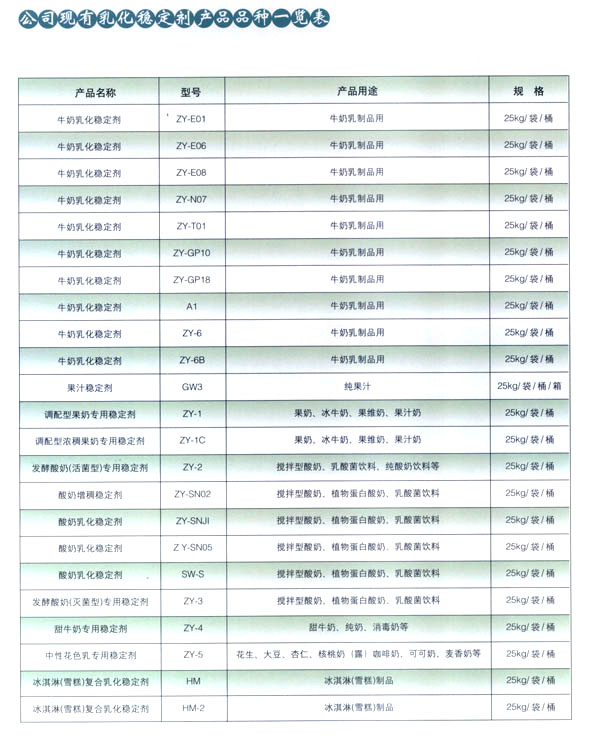 依靠本公司雄厚的科技力量和先進的科技設(shè)備,生產(chǎn)基地已經(jīng)具備了與客戶共同開發(fā)國內(nèi)外先進食品添加劑的應(yīng)用技術(shù)。博適中友公司多年來致力于食品添加劑的研究和開發(fā),突破常規(guī)理念,以市場、用戶為中心,研究開發(fā)各個品種、各個檔次的食品添加劑,品種齊全又多樣,既有出口型又有內(nèi)銷型。公司主要穩(wěn)定劑產(chǎn)品有:乳飲料乳化穩(wěn)定劑、乳酸飲料乳化穩(wěn)定劑、冰淇淋(雪糕)復(fù)合乳化穩(wěn)定劑、果汁飲料乳化穩(wěn)定劑等,產(chǎn)品暢銷國內(nèi)外,覆蓋了全國二十多個省市,并建立了穩(wěn)定的銷售網(wǎng)絡(luò)。