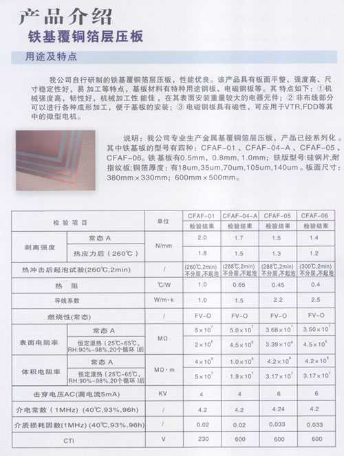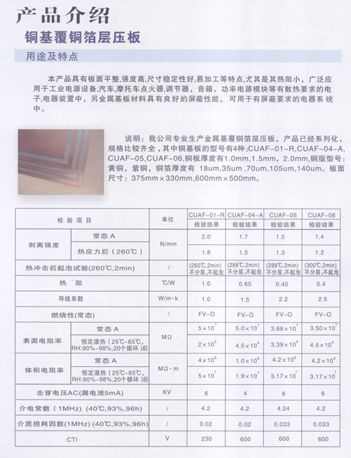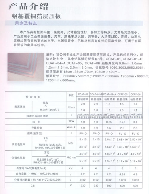 公司生產(chǎn)的CCAF-01型鋁基覆銅箔層壓板,熱阻為1.0℃/W,熱導(dǎo)率為1.0W/m·K;CCAF-04-A型鋁基覆銅箔層壓板,熱阻為0.65℃/W,熱導(dǎo)率為1.3~1.5W/m·K;CCAF-05型鋁基覆銅箔層壓板,熱阻為0.45℃/W,熱導(dǎo)率為2.0~2.2W/m·K,CCAF-06型鋁基覆銅箔層壓板,熱阻為:0.4℃/W,熱導(dǎo)率為2.5~2.8W/m·K。接近國際先進(jìn)水平,自主開發(fā)的散熱器基覆銅箔印制電路板層壓板,填補(bǔ)國內(nèi)空白。公司生產(chǎn)的鋁基覆銅箔板廣泛應(yīng)用于汽車點(diǎn)火器、摩托車調(diào)壓器、音箱模塊電源、通訊模塊電源、變頻模塊電源;各種大功率LED工程景觀照明:洗墻燈、投光燈、草坪燈、水底燈、噴泉燈、路燈、室內(nèi)照明、長1.2米LED照明燈、手電筒及液晶顯示器等。