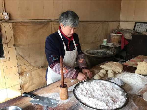 每天凌晨一兩點鐘,沈國平就要去采買當天最新鮮的豬板油,回來清理干凈,和上面粉攪拌均勻,制成面團。麻糕的制作主要由沈國平妻子和兩個姊妹來完成。揉面、搓胚子、配油酥,按餡心、搟均勻,整個過程行云流水,連貫無比。