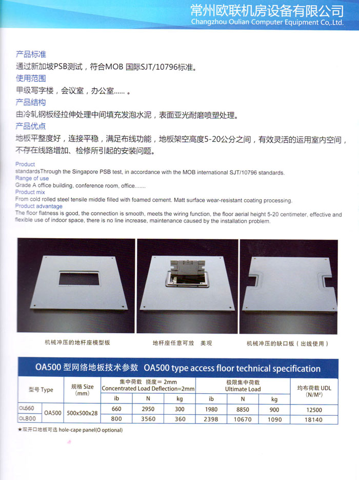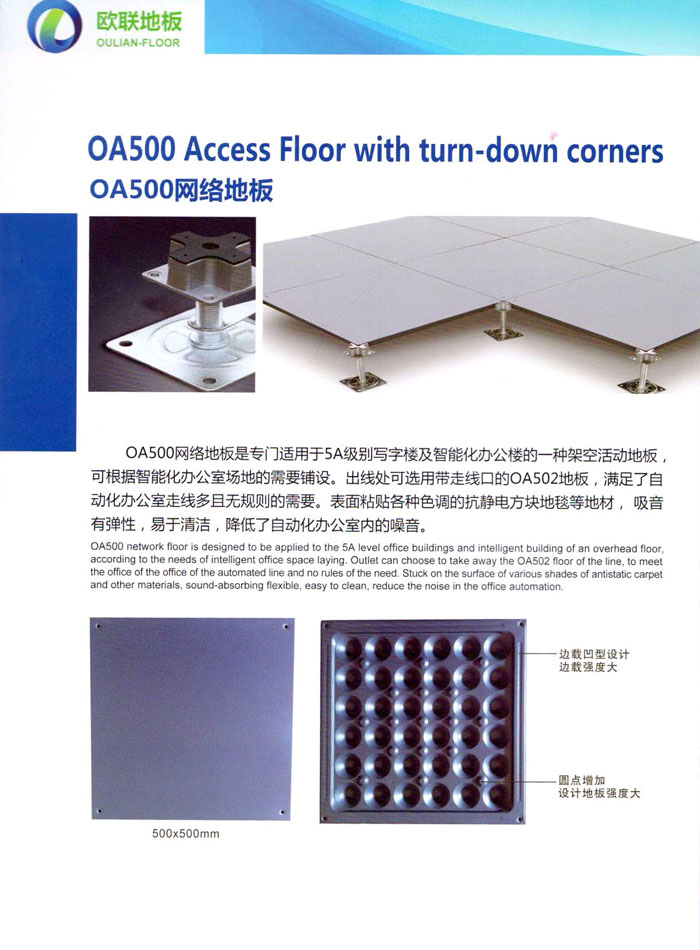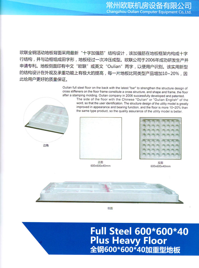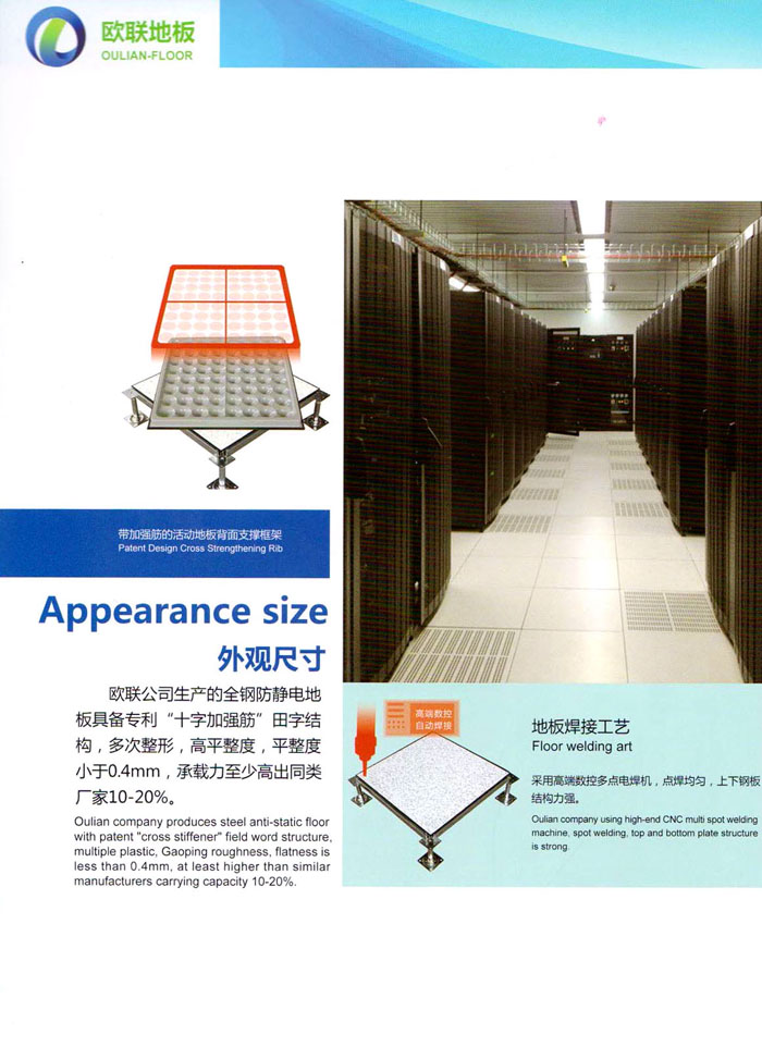 “歐聯(lián)”系列全鋼地板,符合國(guó)家安全要求,種類完備多樣,其中防靜電陶瓷地板、硫酸鈣地板等除具有普通瓷質(zhì)的裝飾和實(shí)用性外,其耐磨、防水、防火功能優(yōu)于其它同類產(chǎn)品,防靜電系列地板,能切合不同客戶的要求,其靈活的配置,深受客戶歡迎,不同材質(zhì)的地板結(jié)構(gòu)使設(shè)計(jì)師的設(shè)計(jì)空間比傳統(tǒng)的更加廣闊自由和善變。