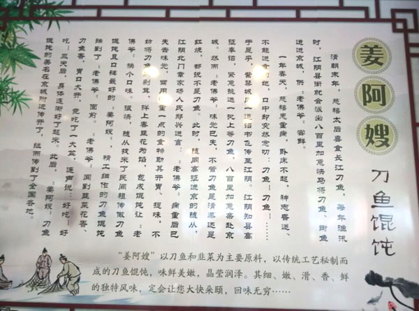 武進(jìn)高新區(qū)姜阿嫂刀魚餛飩店經(jīng)營面積480平方米,可容納150人左右用餐,主要特色刀魚餛飩,蟹黃大湯包,榮獲“江蘇省鄉(xiāng)村美食節(jié)”金獎(jiǎng)和銀獎(jiǎng)。另外還有特色刀魚面,刀魚春卷及蟹肉餛飩,蝦肉餛飩。 本店在經(jīng)營過程中堅(jiān)持以品質(zhì)為主,貨真價(jià)廉,貨品貴面價(jià)不貴,原料“刀魚”全是現(xiàn)場開片去骨。開業(yè)至今,深受廣大消費(fèi)者的好評,是常州地區(qū)唯一以刀魚為特色的餐飲店。