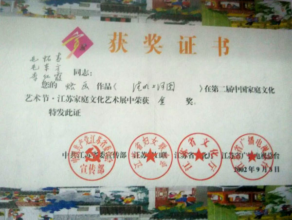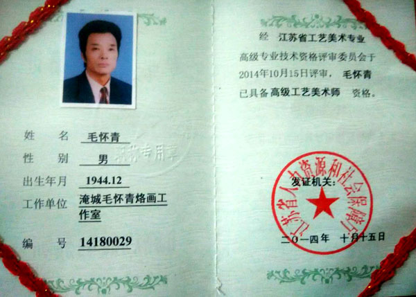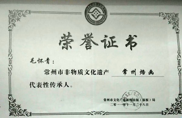 毛懷青,江蘇常州市武進(jìn)人。 中國工藝美術(shù)學(xué)會會員,常州市中國烙畫研究會副會長,常州市文博鑒賞協(xié)會理事,非物質(zhì)文化遺產(chǎn)烙畫傳承人。高級工藝美術(shù)師。 年輕時學(xué)習(xí)國畫、油畫中年蔓現(xiàn)掌州咯畫源遠(yuǎn)流長、歷史悠久,有著其它美術(shù)門類不具備的藝術(shù)風(fēng)格與特色?芍^是工藝美術(shù)中的一朵十分亮麗的藝術(shù)奇葩,是我民族先人給我們留下的一份不可多得十分珍貴的一份文化遺產(chǎn)。為弘揚與發(fā)展這份優(yōu)秀文化遺產(chǎn),我從此下定決心研究烙畫,愿付出一份力量為振興烙畫事業(yè)做出貢獻(xiàn)。至今已潛心研究幾十年,取得了可喜的成績,被業(yè)界公認(rèn),社會關(guān)注與認(rèn)可。有“江南烙畫第一筆”之美譽。 近年來,創(chuàng)作的烙畫作品分別獲得過全國、省市級的金、銀、銅獎多次。中央電視臺曾兩次播放過本人的烙畫作品,江蘇電視臺、常州電視臺也曾多次播放過本人的作品與烙畫藝術(shù)生涯,揚子晚報、常州日報、常州晚報也曾多次報導(dǎo)過本人的烙畫作品,出版物有三種版本都能查閱到介紹本的烙畫從藝生涯與藝術(shù)業(yè)績。