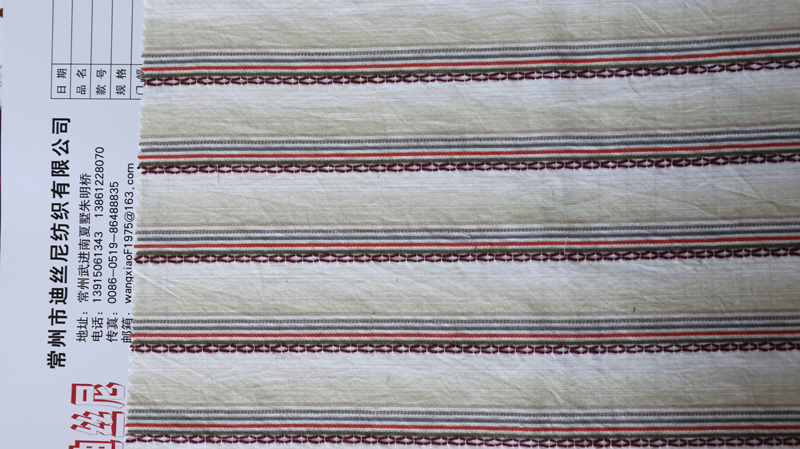 常州市迪絲尼紡織有限公司座落在中外馳名的紡織工業(yè)基地--江蘇常州,位于常州市武進高新區(qū)南夏墅朱明橋7號,交通、通信十分便利。 我公司擁有40臺劍桿織機和36臺進口噴氣織機,年產量500萬米以上,公司產品以色織布為主,包括:米通、青年布、牛津紡、氨綸彈力布,具體分為T/C類、T/R類、全棉類、棉麻類、竹節(jié)類、雙層布、色織條格布和提花格布等。我公司也生產印花布、燈芯絨等。產品暢銷世界各地,深受國內、東南亞及西歐客商的青睞。 我公司秉著誠信、專業(yè)、品質、服務的經營理念,在競爭中合作,在合作中提高。定能成為您忠實的商業(yè)合作伙伴!