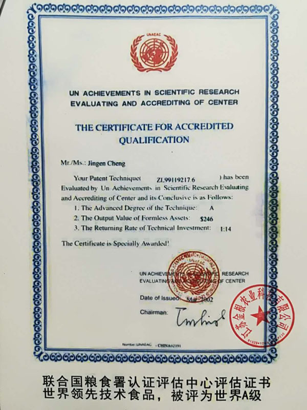 2006年經(jīng)國(guó)家農(nóng)業(yè)部、發(fā)展改革委員會(huì)、聯(lián)合國(guó)糧農(nóng)組織代表、中醫(yī)研究院、中國(guó)科學(xué)技術(shù)協(xié)會(huì)、中醫(yī)藥大學(xué)、農(nóng)業(yè)大學(xué)、農(nóng)學(xué)院、中國(guó)保健協(xié)會(huì)、糧油協(xié)會(huì)、食品研究所等十幾位專家對(duì)該專利產(chǎn)品做了評(píng)估論證,一致認(rèn)為該項(xiàng)技術(shù)先進(jìn)產(chǎn)品突出、食用安全,并給予很高的評(píng)價(jià)。 論證意見: 1、這項(xiàng)專利技術(shù)填補(bǔ)了國(guó)內(nèi)糖尿病特種功效食品的專用品種和栽培技術(shù)空白。 2、采用有機(jī)食品技術(shù),并以有機(jī)農(nóng)產(chǎn)品為原料加工特種營(yíng)養(yǎng)食品,提高了產(chǎn)品的安全性。 3、用鉻、硒、鋅、鎂、鋰生物強(qiáng)化栽培技術(shù)已獲得發(fā)明專利,為國(guó)際先進(jìn)水平。 4、經(jīng)過(guò)10多年的應(yīng)用實(shí)踐,進(jìn)一步證明了通過(guò)飲食調(diào)理,可預(yù)防糖尿病,對(duì)已患糖尿病者有緩解和預(yù)防糖尿病綜合癥的功效。