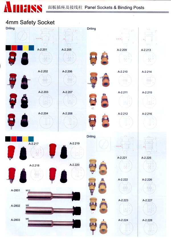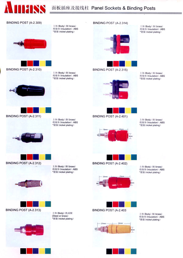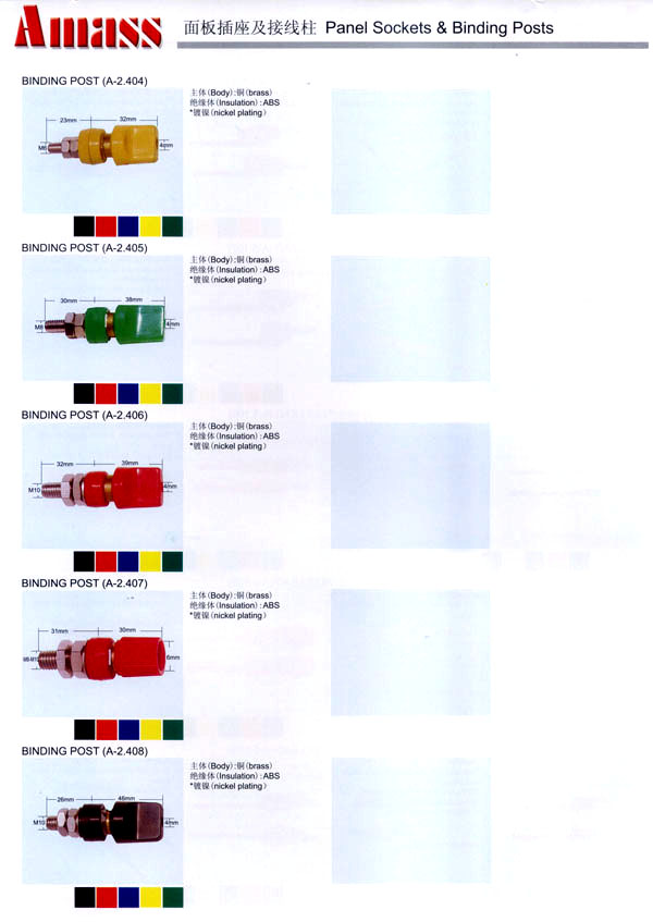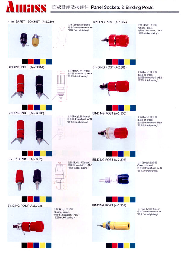 本公司專業(yè)生產(chǎn)各類香蕉插頭,香蕉插座,接線柱,電瓶夾,鱷魚夾,測試導(dǎo)線,測試筆等。產(chǎn)品分2mm/2.5mm/3mm/3.5mm/4mm五大系列,百余種款式, 各種香蕉插廣泛用于儀器、儀表、電力測試、教學(xué)、玩具,視聽設(shè)備、醫(yī)療儀器,保健產(chǎn)品等領(lǐng)域。公司技術(shù)力量雄厚,生產(chǎn)工藝先進(jìn),產(chǎn)品遠(yuǎn)銷港、臺、歐美,并與飛利浦等國際品牌配套。公司本著精益求精的理念,歡迎新老客戶光臨。