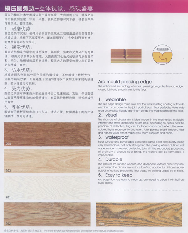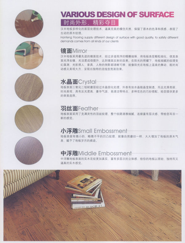 常州漢豐裝飾材料有限公司是一家涉及強化地板制造、屏風(fēng)鋁材生產(chǎn)、進(jìn)出口貿(mào)易的大型公司。2001年公司投入重資.全面引進(jìn)世界頂級一體化自動流水生產(chǎn)線和具有國際先進(jìn)水準(zhǔn)的德國權(quán)威木地板生產(chǎn)技術(shù),興建強化地板生產(chǎn)基地。多年以來.一直不斷加強生產(chǎn)設(shè)備、廠房基礎(chǔ)投入,目前公司年生產(chǎn)強化地板能力已經(jīng)達(dá)到了500萬平方米,步入國內(nèi)一流行列,具備了雄厚的國際競爭力。 漢豐地板以奉獻(xiàn)生活中最完美的地板為發(fā)展目標(biāo),時尚流行的設(shè)計風(fēng)格和多樣化的產(chǎn)品類型,贏得了市場的廣泛贊譽和肯定。產(chǎn)品嚴(yán)格按照歐洲標(biāo)準(zhǔn)檢測強化木地板的各項性能指標(biāo).達(dá)到百分百的國際技術(shù)標(biāo)準(zhǔn),確保了每一塊地板都有著上乘品質(zhì),是綠色環(huán)保的好地板。并先后通過了Isc)9001國際質(zhì)量管理體系認(rèn)證,IS014001國際環(huán)境管理體系認(rèn)證.中國環(huán)境標(biāo)志產(chǎn)品認(rèn)證,深得用戶的一致好評,是寫字樓、商場、大型超市、學(xué)校、建筑樓宇、娛樂場所、家用私宅等鋪裝的首選地板。