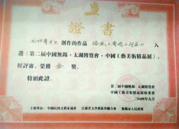 毛懷青,江蘇常州市武進(jìn)人。 中國(guó)工藝美術(shù)學(xué)會(huì)會(huì)員,常州市中國(guó)烙畫研究會(huì)副會(huì)長(zhǎng),常州市文博鑒賞協(xié)會(huì)理事,非物質(zhì)文化遺產(chǎn)烙畫傳承人。高級(jí)工藝美術(shù)師。 年輕時(shí)學(xué)習(xí)國(guó)畫、油畫中年蔓現(xiàn)掌州咯畫源遠(yuǎn)流長(zhǎng)、歷史悠久,有著其它美術(shù)門類不具備的藝術(shù)風(fēng)格與特色?芍^是工藝美術(shù)中的一朵十分亮麗的藝術(shù)奇葩,是我民族先人給我們留下的一份不可多得十分珍貴的一份文化遺產(chǎn)。為弘揚(yáng)與發(fā)展這份優(yōu)秀文化遺產(chǎn),我從此下定決心研究烙畫,愿付出一份力量為振興烙畫事業(yè)做出貢獻(xiàn)。至今已潛心研究幾十年,取得了可喜的成績(jī),被業(yè)界公認(rèn),社會(huì)關(guān)注與認(rèn)可。有“江南烙畫第一筆”之美譽(yù)。 近年來(lái),創(chuàng)作的烙畫作品分別獲得過(guò)全國(guó)、省市級(jí)的金、銀、銅獎(jiǎng)多次。中央電視臺(tái)曾兩次播放過(guò)本人的烙畫作品,江蘇電視臺(tái)、常州電視臺(tái)也曾多次播放過(guò)本人的作品與烙畫藝術(shù)生涯,揚(yáng)子晚報(bào)、常州日?qǐng)?bào)、常州晚報(bào)也曾多次報(bào)導(dǎo)過(guò)本人的烙畫作品,出版物有三種版本都能查閱到介紹本的烙畫從藝生涯與藝術(shù)業(yè)績(jī)。