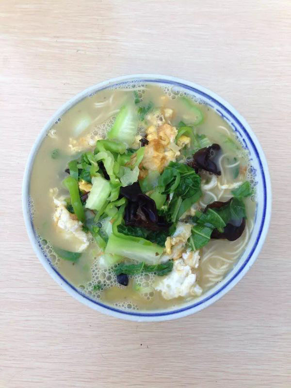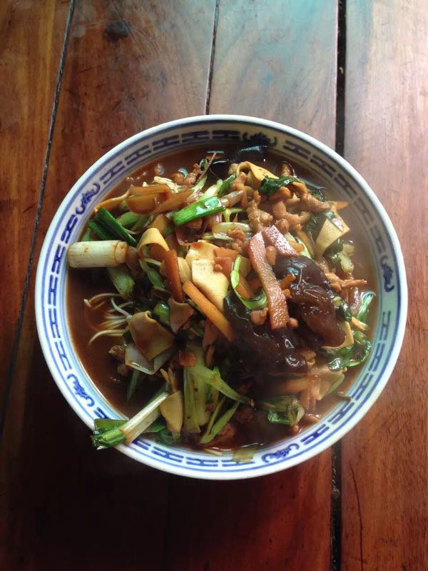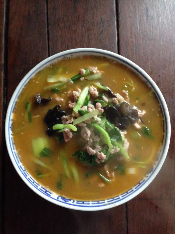 和一般面館事先燒制好澆頭,放在盆里供客人選擇不同,青城面館的澆頭都是一份份現(xiàn)炒的,特別講究食材的新鮮。就拿暢銷的肉絲蔬菜紅湯面來說,要先起猛火,把肉絲、木耳、蘑菇、青菜等食材