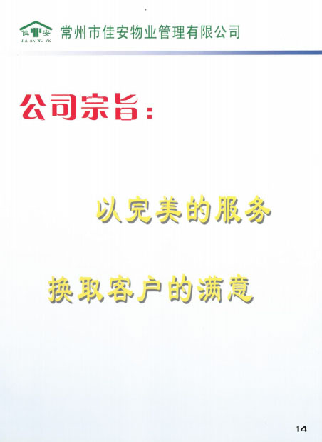 佳安物業(yè)管理有限公司位于常州市新北區(qū)薛家鎮(zhèn),2005年由薛家鎮(zhèn)黨委政府注冊(cè)成立,注冊(cè)資金50萬(wàn)元,屬于三級(jí)資質(zhì)企業(yè)。成立之初,佳安物業(yè)作為政屬事業(yè)單位,主要負(fù)責(zé)管理薛家鎮(zhèn)順園新村安置小區(qū)。隨著薛家鎮(zhèn)經(jīng)濟(jì)和人口的發(fā)展,為主動(dòng)適應(yīng)經(jīng)濟(jì)發(fā)展新常態(tài),全面深化物業(yè)綜合改革,打造具有薛家特色的物業(yè)公司,佳安物業(yè)由政府下屬的事業(yè)單位正式轉(zhuǎn)變?yōu)楠?dú)立運(yùn)營(yíng)的企業(yè),并增資到1000萬(wàn)元。 2017年6月,公司通過(guò)審核被評(píng)為“AAA”級(jí)信用企業(yè),同月,公司實(shí)施ISO9001質(zhì)量管理體系標(biāo)準(zhǔn),并于8月通過(guò)質(zhì)量體系認(rèn)證審核。2018年8月,公司通過(guò)了ISO14001環(huán)境管理體系、ohsas18001職業(yè)健康安全管理體系的認(rèn)證審核。 目前,公司主要承接小區(qū)物業(yè)服務(wù)及廠區(qū)外派保安服務(wù)、保潔服務(wù)等。現(xiàn)公司為薛家鎮(zhèn)順園一村至順園九村安置小區(qū)及奧林匹克花園、怡景名園2處商業(yè)小區(qū)提供物業(yè)服務(wù);為江南農(nóng)村商業(yè)銀行新北區(qū)所有支行、中車鐵馬、投資服務(wù)中心、華夏藝博園、薛家幼兒園、薛家小學(xué)及薛家中學(xué)等單位提供外派保安服務(wù);為薛家鎮(zhèn)中心廣場(chǎng)及松林別墅提供保安服務(wù);為華夏藝博園及投資服務(wù)中心提供保潔服務(wù)等。 在這十余年中,佳安物業(yè)與時(shí)俱進(jìn),銳意進(jìn)取,為地方建設(shè)發(fā)展注入動(dòng)力,為居民和企業(yè)安全保駕護(hù)航,尤其是在實(shí)踐中,我們積極探索,正逐步摸索出一條適合薛家城鄉(xiāng)一體化建設(shè)的社區(qū)物業(yè)管理的新路。希望通過(guò)今天的分享,和大家一起探討我們?cè)凇肮苻k分離”等方面的實(shí)踐經(jīng)驗(yàn),并在此基礎(chǔ)上為薛家的可持續(xù)發(fā)展提供可借鑒、推廣的新型物業(yè)管理之路。