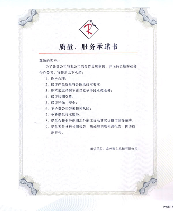 聚仁重效率更重質(zhì)量;在聚仁,寧缺毋濫的精品意識(shí)是每個(gè)員工的責(zé)任,制造精良產(chǎn)品是每個(gè)員工永遠(yuǎn)的追求。聚仁立求做到要效率,更要質(zhì)量,除了品質(zhì)一流的產(chǎn)品外,其它產(chǎn)品絕不交付客戶。聚仁重現(xiàn)場(chǎng)更重市場(chǎng):市場(chǎng)決定現(xiàn)場(chǎng),現(xiàn)場(chǎng)連著市場(chǎng),現(xiàn)場(chǎng)為市場(chǎng)服務(wù),在搞好現(xiàn)場(chǎng)管理的同時(shí),實(shí)現(xiàn)與市場(chǎng)和客戶的雙贏。聚仁對(duì)客戶的承諾是:不合格的材料不進(jìn)廠,不合格的半成品不轉(zhuǎn)序,不合格的產(chǎn)品不交付,以百分之百的合格品交付客戶。