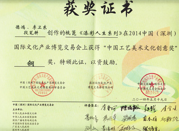 公司榮譽(yù)介紹: “2009年常州市旅游商品創(chuàng)新設(shè)計(jì)大賽”,“覽盡千荷”綠檀雕刻梳榮獲三等獎(jiǎng); “2011年常州市旅游商品創(chuàng)新設(shè)計(jì)大賽”,“彩印工藝梳-我們的年代(80)”榮獲二等獎(jiǎng)。 “2011年中國(guó)包裝創(chuàng)意設(shè)計(jì)大賽“,虞美人彩印梳篦系列包裝獲得一等獎(jiǎng); “2011年中國(guó)包裝創(chuàng)意設(shè)計(jì)大賽”,虞美人筷子系列包裝獲得三等獎(jiǎng); “2011創(chuàng)意中國(guó).第五屆設(shè)計(jì)藝術(shù)大獎(jiǎng)賽”,虞美人系列包裝獲得三等獎(jiǎng); “2011首屆中國(guó)(無(wú)錫)國(guó)際文化藝術(shù)博覽會(huì)”,漆藝對(duì)梳《喜玫瑰》獲得“藝博杯“銅獎(jiǎng)。 “第十三屆中國(guó)工藝美術(shù)大師作品暨國(guó)際藝術(shù)精品博覽會(huì)”, 漆藝梳《報(bào)喜鳥》榮獲2012“儒士儒家•百花杯”中國(guó)工藝美術(shù)精品獎(jiǎng)優(yōu)秀獎(jiǎng) “第十三屆中國(guó)工藝美術(shù)大師作品暨國(guó)際藝術(shù)精品博覽會(huì)”, 虞美人《渾然天成》榮獲2012“儒士儒家•百花杯”中國(guó)工藝美術(shù)精品獎(jiǎng)金獎(jiǎng) “2012江蘇省工藝美術(shù)精品大獎(jiǎng)賽”,虞美人《S型梳》喜獲“藝博杯”銀獎(jiǎng) “第十四屆中國(guó)工藝美術(shù)大師作品暨國(guó)際藝術(shù)精品博覽會(huì)”, 虞美人工藝梳《新型十二星座梳》榮獲2013“國(guó)信•百花杯”中國(guó)工藝美術(shù)精品獎(jiǎng)優(yōu)秀獎(jiǎng) “2013【藝博杯】江蘇省工藝美術(shù)精品大獎(jiǎng)賽”,虞美人《萬(wàn)事如意系列》喜獲“藝博杯”銀獎(jiǎng) “2013江蘇省工藝美術(shù)新人新作成果展作品大獎(jiǎng)賽”,虞美人《壺(福)的藝術(shù)》喜獲“藝博杯”入圍獎(jiǎng) 2013年度江蘇省“蘇商領(lǐng)袖峰會(huì)”,常州市卓尚飾品有限公司榮獲最具成長(zhǎng)性企業(yè)獎(jiǎng) 常州市卓尚飾品(虞美人)有限公司總經(jīng)理李衛(wèi)東榮獲“常州創(chuàng)意產(chǎn)業(yè)協(xié)會(huì)2013年底慈善獎(jiǎng)榮譽(yù)” 常州市卓尚飾品有限公司榮獲薛家鎮(zhèn)人民政府2013年度“創(chuàng)新創(chuàng)優(yōu)”獎(jiǎng) 常州市卓尚飾品有限公司榮獲薛家鎮(zhèn)人民政府2013年度“銷售業(yè)績(jī)”獎(jiǎng) 2014中國(guó)(深圳)國(guó)際文化產(chǎn)業(yè)博覽交易會(huì),劉燕西、李衛(wèi)東、段筆耕<十二星座系列>獲得“中國(guó)工藝美術(shù)文化創(chuàng)意獎(jiǎng)”銀獎(jiǎng) 2014中國(guó)(深圳)國(guó)際文化產(chǎn)業(yè)博覽交易會(huì),徐德鴻、李衛(wèi)東、段筆耕《漆彩人生系列》獲得“中國(guó)工藝美術(shù)文化創(chuàng)意獎(jiǎng)”銅獎(jiǎng) 文化創(chuàng)意大獎(jiǎng)賽“紫金獎(jiǎng)” ,有余(魚)系列梳篦產(chǎn)品獲得了優(yōu)秀獎(jiǎng) 2014吟飛杯首屆常州文化創(chuàng)意和設(shè)計(jì)大賽,虞美人有余(魚)系列梳篦產(chǎn)品榮獲優(yōu)秀設(shè)計(jì)獎(jiǎng) 2014吟飛杯首屆常州文化創(chuàng)意和設(shè)計(jì)大賽,虞美人“云,月”系列梳篦產(chǎn)品榮獲優(yōu)秀設(shè)計(jì)獎(jiǎng) 2014藝博杯江蘇省工藝美術(shù)精品大獎(jiǎng)賽,虞美人《梳篦:酒醉的探戈》喜獲銀獎(jiǎng) 2014“中國(guó)原創(chuàng)•百花杯”中國(guó)工藝美術(shù)精品大獎(jiǎng)賽,虞美人《梳篦-江南風(fēng)韻系列》喜獲銀獎(jiǎng) 常州市卓尚飾品有限公司獲“2014年常州市電子商務(wù)協(xié)會(huì)2014年度優(yōu)秀會(huì)員單位” 2014“虞美人”成為常州市知名商標(biāo)。