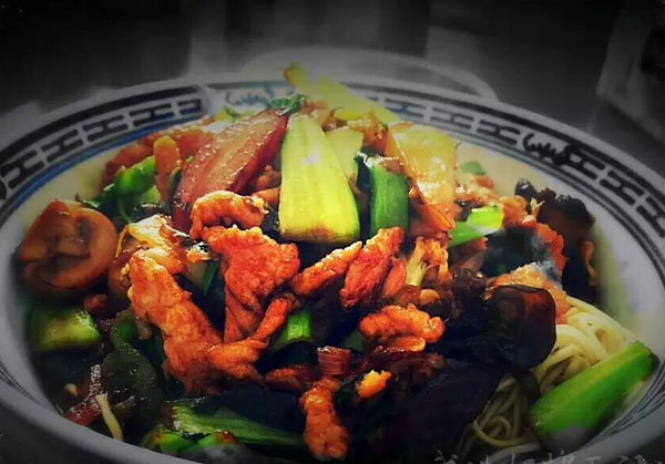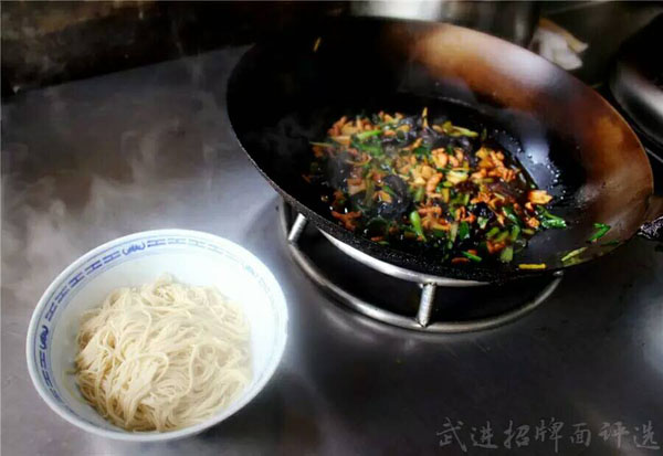 放一起煸炒至香,然后澆在撈起的面條上。一碗面出來,現(xiàn)炒的澆頭與面條融合,味道香郁至極。