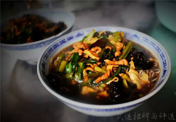 和一般面館事先燒制好澆頭,放在盆里供客人選擇不同,青城面館的澆頭都是一份份現(xiàn)炒的,特別講究食材的新鮮。就拿暢銷的肉絲蔬菜紅湯面來說,要先起猛火,把肉絲、木耳、蘑菇、青菜等食材