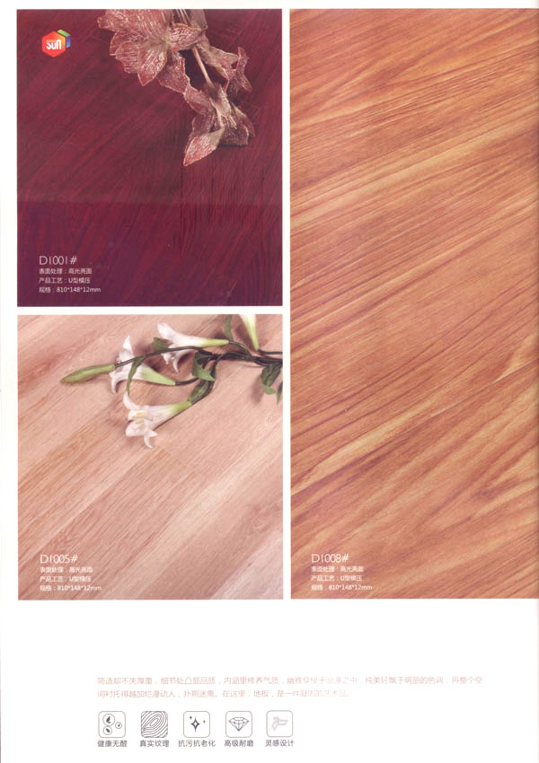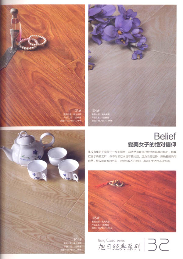 品牌保證,質(zhì)量放心 公司旗下“霞光.旭日”品牌地板系列由旭日皇家、旭日經(jīng)典、旭日戀家、至尊奢華、巧奪天工、水晶陶瓷等幾個(gè)系列構(gòu)成,配有專職質(zhì)量檢驗(yàn)人員,嚴(yán)把產(chǎn)品質(zhì)量關(guān),不斷完善產(chǎn)品質(zhì)量體系、監(jiān)控管理體系。公司對(duì)客戶需求全面、科學(xué)、準(zhǔn)確地把握,確保對(duì)客戶市場適時(shí)高效反應(yīng)。一流的設(shè)備、精心的選材、完美的工藝以及對(duì)產(chǎn)品品味不倦的追求,令奔公司產(chǎn)品獨(dú)樹一幟。