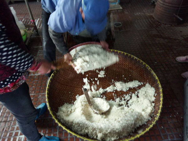 第三步:拌入酒曲,這時候才發(fā)現(xiàn)了“木桶”的神奇之處:一頭空,另一頭也是空,只不過用鋼筋做了個柵欄。之前蒸米飯,老徐是墊上了蒲草,一方面讓糯米飯更易熟,另一方面也增加了糯米飯的清香氣息。把糯米飯倒入蠶匾中,邊翻動糯米飯邊撒上酒曲,使酒曲與糯米飯充分拌勻。
