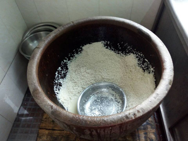 第二步:冷卻降溫,糯米蒸熟后,用冷水淋沐,直至糯米飯溫度降到35℃左右。要知道這個溫度非常關鍵,太冷了會影響之后酒曲發(fā)酵,溫度太高會把酒曲中的酵母殺死。不靠溫度計,老徐靠得完全是自己多年的經驗。