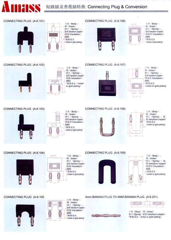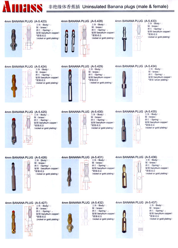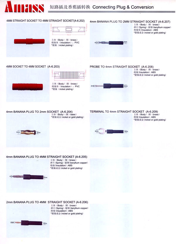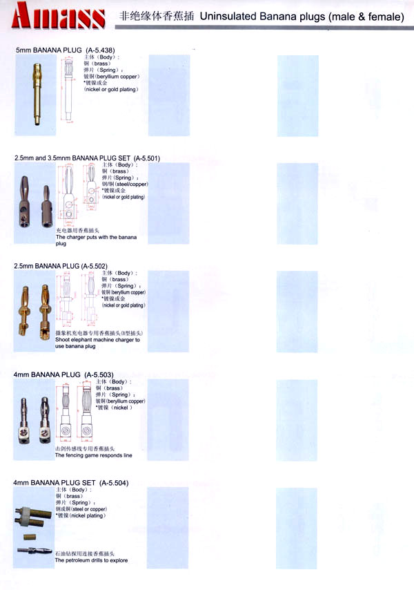 本公司專(zhuān)業(yè)生產(chǎn)各類(lèi)香蕉插頭,香蕉插座,接線(xiàn)柱,電瓶夾,鱷魚(yú)夾,測(cè)試導(dǎo)線(xiàn),測(cè)試筆等。產(chǎn)品分2mm/2.5mm/3mm/3.5mm/4mm五大系列,百余種款式, 各種香蕉插廣泛用于儀器、儀表、電力測(cè)試、教學(xué)、玩具,視聽(tīng)設(shè)備、醫(yī)療儀器,保健產(chǎn)品等領(lǐng)域。公司技術(shù)力量雄厚,生產(chǎn)工藝先進(jìn),產(chǎn)品遠(yuǎn)銷(xiāo)港、臺(tái)、歐美,并與飛利浦等國(guó)際品牌配套。公司本著精益求精的理念,歡迎新老客戶(hù)光臨。
