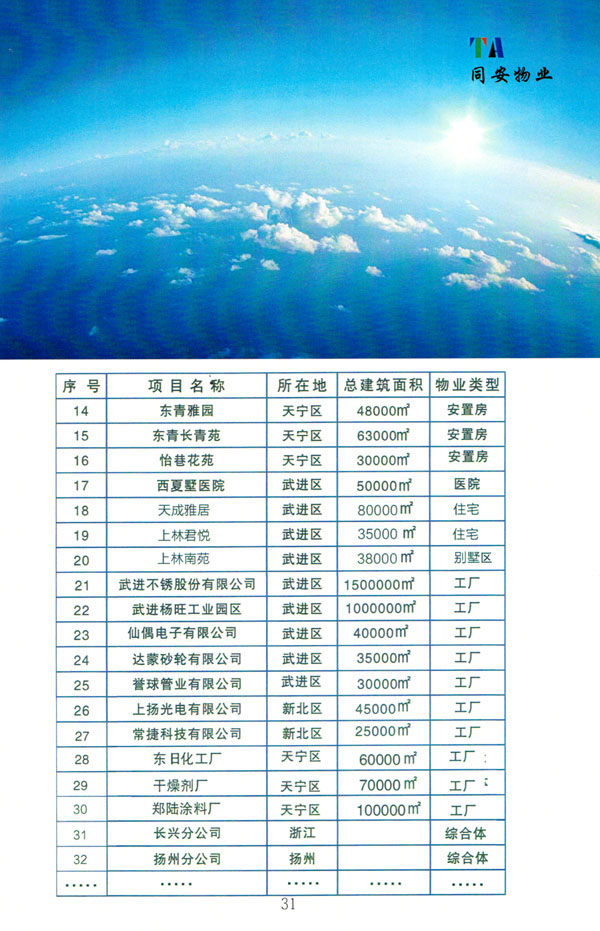 常州市同安物業(yè)管理有限公司注冊1999年,發(fā)展至今已有多年歷史,本公司坐落于美麗的龍城常州,秉承“融聚無限未來”的核心理念,融專業(yè)認才,匯優(yōu)質(zhì)資源以”專心,細心,耐心”的服務態(tài)度,為客戶打造“安心,順心,稱心”的服務感受。 公司始終以“打造中國最值得信賴和最值得尊重的物業(yè)管理服務集成商”為愿景自我鞭策,不斷前行。同安物業(yè)以客戶滿意為終極目標,不斷加強”崗位資格認證能力,人才招聘與職業(yè)化培訓能力,產(chǎn)品策劃與管理設(shè)計能力,品質(zhì)監(jiān)督與管控能力,技術(shù)更新與運營優(yōu)化力“五大專業(yè)能力的培養(yǎng)和提升,實現(xiàn)“精品化管理,專業(yè)化服務”。 公司發(fā)展至今,員工總數(shù)近千余人,大專以上學歷200多人,中高級技術(shù)人員160人,維修人員140人,物業(yè)管理師80名,公司接管面積達3100000多平方米,設(shè)涉及住宅小區(qū),別墅,大型游樂場,公園,醫(yī)院,廠區(qū),商業(yè)等。公司的工作管理逐步導入ISO9001質(zhì)量體系和ISO4001環(huán)境管理體系和GB/T28001職業(yè)健康安全管理體系,嚴格按照質(zhì)量體系的標準執(zhí)行。