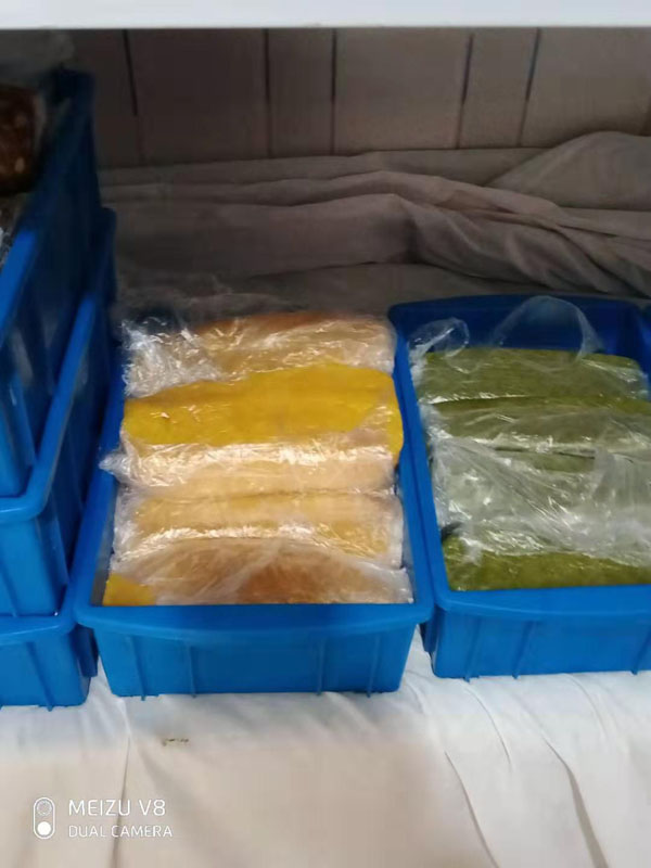 腳踏糕本名“年糕”,按常州周邊地區(qū)的風(fēng)俗習(xí)慣,在春季前夕,各家各戶都要蒸年糕,吃年糕!案狻敝C音“高”,過年吃年糕被賜予“年年高”,一年高一年,鋒吉祥之意,表達這人們對未來美好生活的憧憬和良好的祝愿。今天小編要帶大家的就是一家至今保持著傳統(tǒng)手工制作的鈺鋒糕點坊。   鈺鋒糕點坊位于常州鄭陸鎮(zhèn)三皇廟范家莊,一個比較偏僻的村莊,雖然這家作坊不大,但香糯絲滑,軟糯適中,韌勁十足的腳踏糕吸引了無數(shù)的食客。制作一條腳踏糕要從淘米,浸泡,碾粉,鋪粉,一層一層的鋪下去,需要無數(shù)道制作工序,這些都是店主孫煥公公老周,憑著幾十年的經(jīng)驗,加上店主孫煥從不馬虎的決心!   這“腳踏”也并非赤腳上陣,而是把蒸好的糕倒入早以準備好的框子里,用布包裹好,上面再用薄膜包好,再蓋上布,再換上專門腳踏的布鞋,踩的時候要勻稱,左右腳要配合好,不然糕會高高低低,不平整,最后再拿蠟燭線拆成一條小長條,再拿帶包裝好,如此又香又糯的腳踏糕就大功告成了。   店主孫煥為了讓更多的人認識和了解常州腳踏糕的傳統(tǒng)文化和美食,她在傳統(tǒng)工藝中增加了適合現(xiàn)代文化的多種口味,她在糕里加入南瓜,紫薯,老紅糖,大麥汁,血糯米,核桃,葡萄干,紅棗等食材,做出五顏六色,純天然的口味,深受食客們的喜愛,不管是送人還是自己吃都非常新穎。